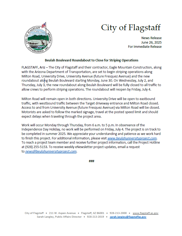 Beulah Boulevard Roundabout to Close for Striping Operations