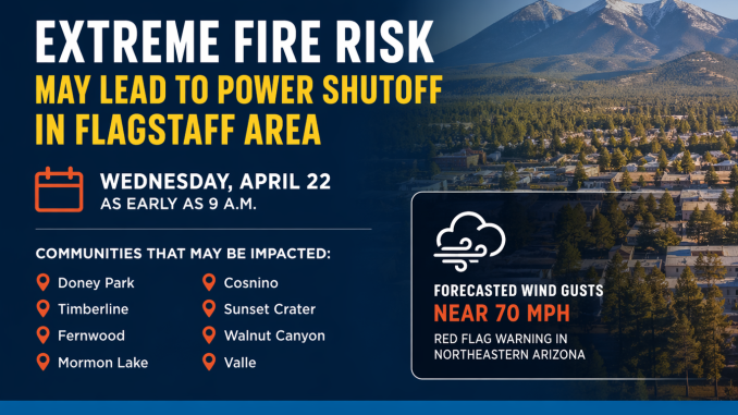 FLAGSTAFF, Ariz. — Arizona Public Service (APS) is warning that it may implement a Public Safety Power Shutoff (PSPS) in parts of the Flagstaff area on Wednesday, April 22, as early as 9 a.m., due to extreme wildfire risk conditions.