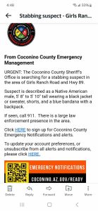 3:32 PM CCSO Deputies and EMS are responding to the area of Silver Saddle and Highway 89 for a stabbing that just occurred. The suspect is possibly in a nearby campground. He is described as a Native American male in his 30s possibly wearing dark clothing. Update: CCSO and EMS are also responding to Forest service Rd 545 near Bonito Campground possibly for a possible second person stabbed.