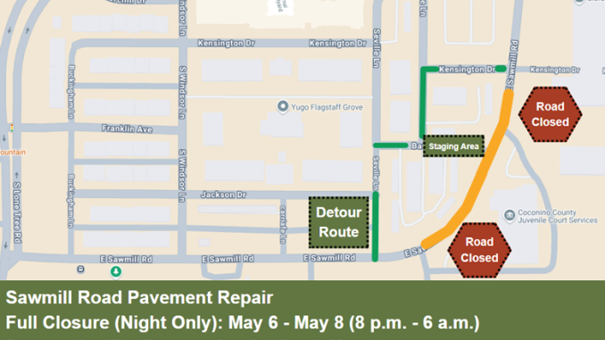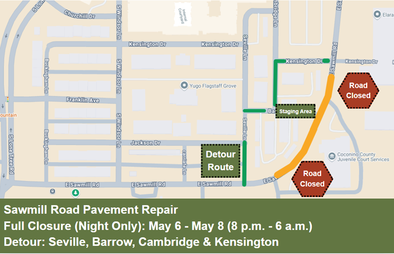 FLAGSTAFF, Ariz – Due to the additional traffic on Sawmill Road related to the Lone Tree Overpass detour route, pavement repair has been scheduled on a portion of Sawmill Road. The work will require overnight full closures of Sawmill Road from the Police Department public parking lot driveway to Kensington Dr. for two nights. The work will take place from 8 p.m. Tuesday, May 6 to 6 a.m. Wednesday, May 7 and from 8 p.m. Wednesday, May 7 to 6 a.m. Thursday, May 8. Motorists in the area should follow the detour route on Seville Ln, Barrow Ave, Cambridge Ln, and Kensington Dr. A portion of Barrow Ave will be used as a staging area from Monday, May 5 – Thursday, May 8.