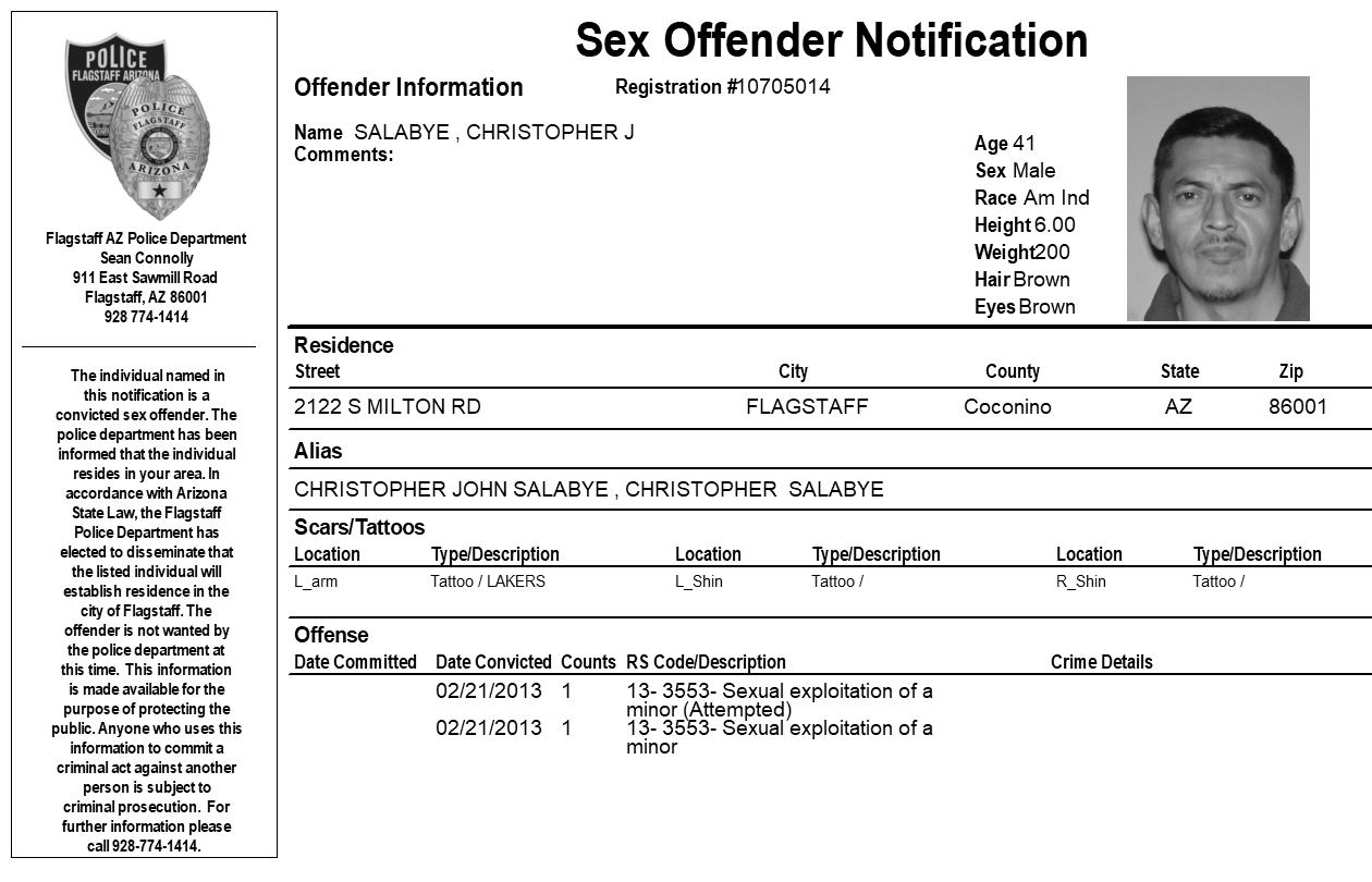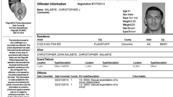 FLAGSTAFF, Az. – The Flagstaff Police Department is requesting your assistance in completing a community notification related to convicted sex offender residing in our community. This notification is being made pursuant to Arizona Revised Statute 13-3825, the Community Notification on Sex Offender Law. The individual listed in the attached electronic flier has been convicted of sex offenses which allow for community notification. They are not wanted by the Flagstaff Police Department at this time.