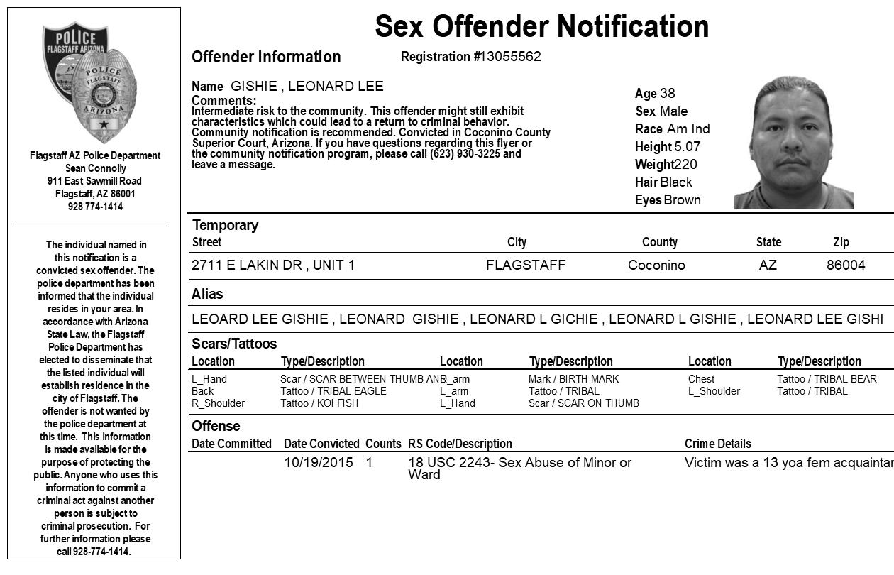FLAGSTAFF, Az. – The Flagstaff Police Department is requesting your assistance in completing a community notification related to convicted sex offender residing in our community. This notification is being made pursuant to Arizona Revised Statute 13-3825, the Community Notification on Sex Offender Law. The individual listed in the attached electronic flier has been convicted of sex offenses which allow for community notification. They are not wanted by the Flagstaff Police Department at this time.
