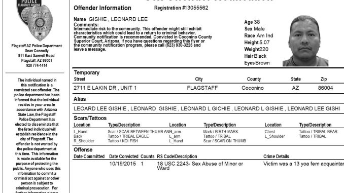 FLAGSTAFF, Az. – The Flagstaff Police Department is requesting your assistance in completing a community notification related to convicted sex offender residing in our community. This notification is being made pursuant to Arizona Revised Statute 13-3825, the Community Notification on Sex Offender Law. The individual listed in the attached electronic flier has been convicted of sex offenses which allow for community notification. They are not wanted by the Flagstaff Police Department at this time.