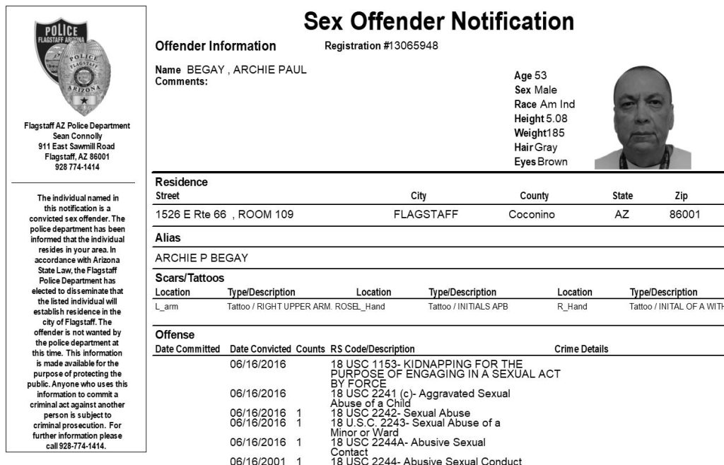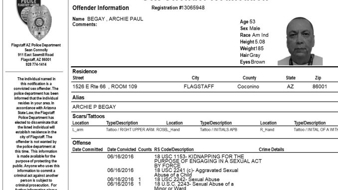 FLAGSTAFF, Az. – The Flagstaff Police Department is requesting your assistance in completing a community notification related to convicted sex offender residing in our community. This notification is being made pursuant to Arizona Revised Statute 13-3825, the Community Notification on Sex Offender Law. The individual listed in the attached electronic flier has been convicted of sex offenses which allow for community notification. They are not wanted by the Flagstaff Police Department at this time.