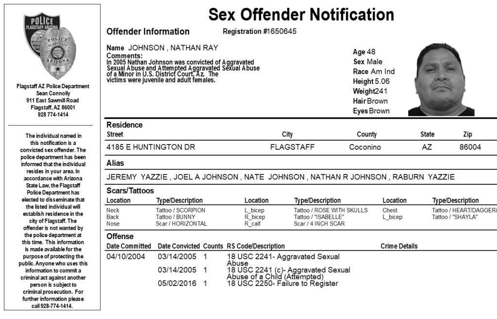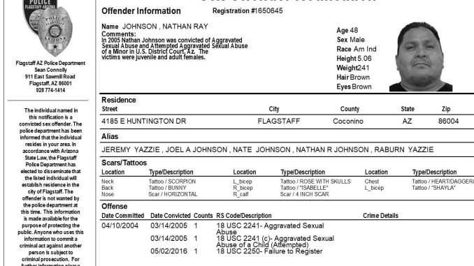 FLAGSTAFF, Az. – The Flagstaff Police Department is requesting your assistance in completing a community notification related to convicted sex offender residing in our community. This notification is being made pursuant to Arizona Revised Statute 13-3825, the Community Notification on Sex Offender Law. The individual listed in the attached electronic flier has been convicted of sex offenses which allow for community notification. They are not wanted by the Flagstaff Police Department at this time.