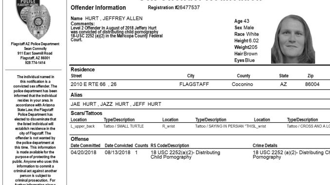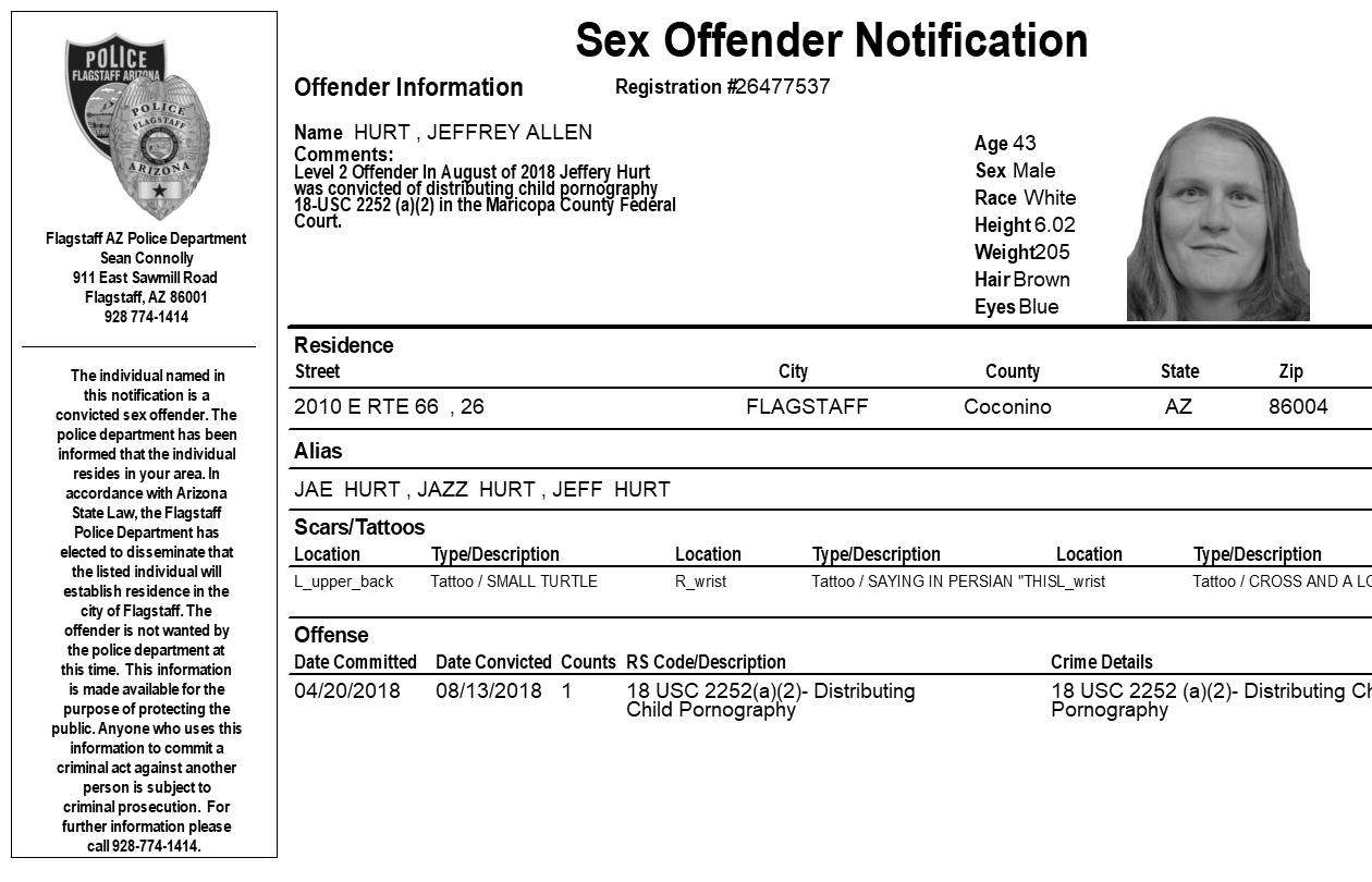 FLAGSTAFF, Az. – The Flagstaff Police Department is requesting your assistance in completing a community notification related to convicted sex offender residing in our community. This notification is being made pursuant to Arizona Revised Statute 13-3825, the Community Notification on Sex Offender Law. The individual listed in the attached electronic flier has been convicted of sex offenses which allow for community notification. They are not wanted by the Flagstaff Police Department at this time.