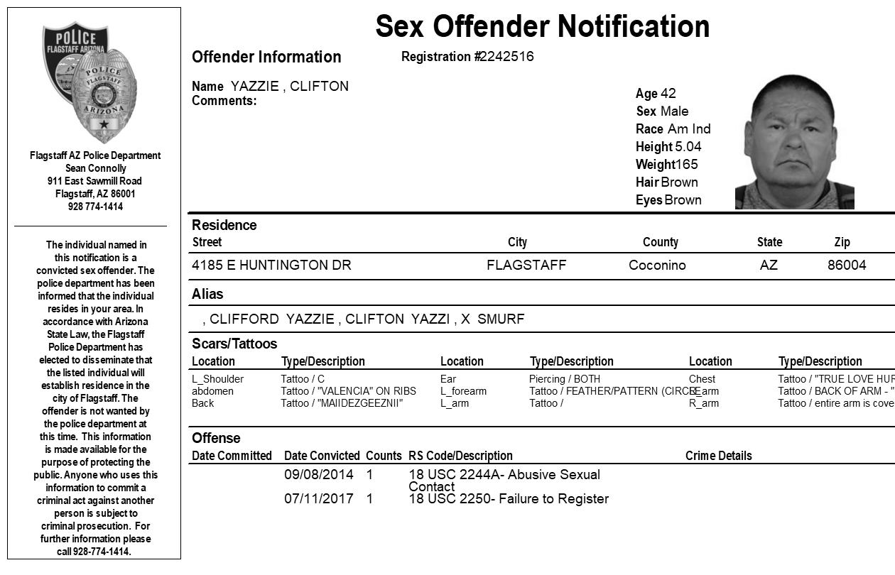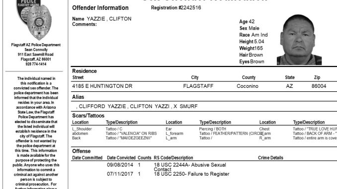 FLAGSTAFF, Az. – The Flagstaff Police Department is requesting your assistance in completing a community notification related to convicted sex offender residing in our community. This notification is being made pursuant to Arizona Revised Statute 13-3825, the Community Notification on Sex Offender Law. The individual listed in the attached electronic flier has been convicted of sex offenses which allow for community notification. They are not wanted by the Flagstaff Police Department at this time.