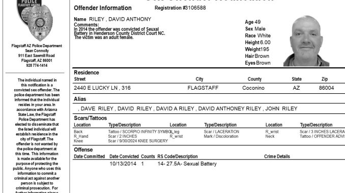 FLAGSTAFF, Az. – The Flagstaff Police Department is requesting your assistance in completing a community notification related to convicted sex offender residing in our community. This notification is being made pursuant to Arizona Revised Statute 13-3825, the Community Notification on Sex Offender Law. The individual listed in the attached electronic flier has been convicted of sex offenses which allow for community notification. They are not wanted by the Flagstaff Police Department at this time.
