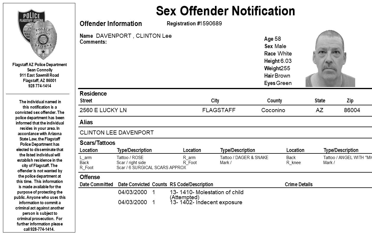 FLAGSTAFF, Az. – The Flagstaff Police Department is requesting your assistance in completing a community notification related to convicted sex offender residing in our community. This notification is being made pursuant to Arizona Revised Statute 13-3825, the Community Notification on Sex Offender Law. The individual listed in the attached electronic flier has been convicted of sex offenses which allow for community notification. They are not wanted by the Flagstaff Police Department at this time.