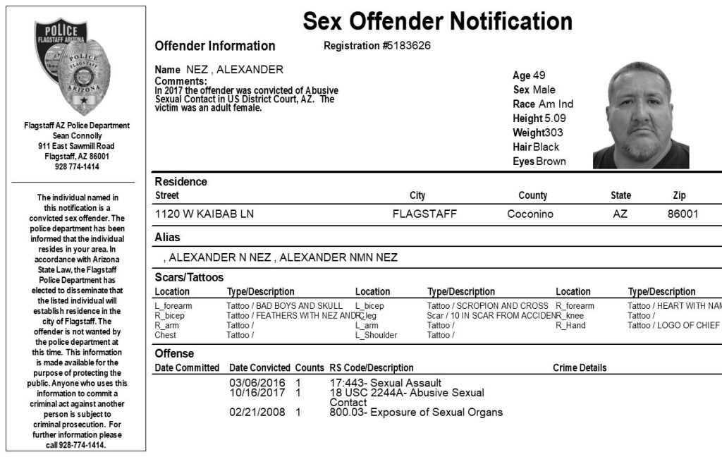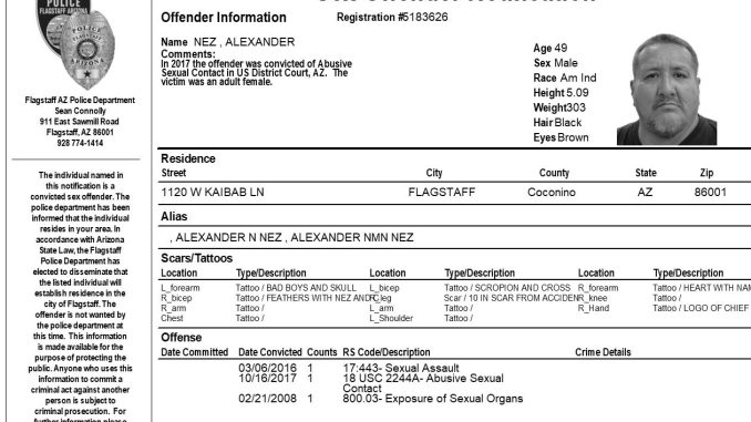 FLAGSTAFF, Az. – The Flagstaff Police Department is requesting your assistance in completing a community notification related to convicted sex offender residing in our community. This notification is being made pursuant to Arizona Revised Statute 13-3825, the Community Notification on Sex Offender Law. The individual listed in the attached electronic flier has been convicted of sex offenses which allow for community notification. They are not wanted by the Flagstaff Police Department at this time.