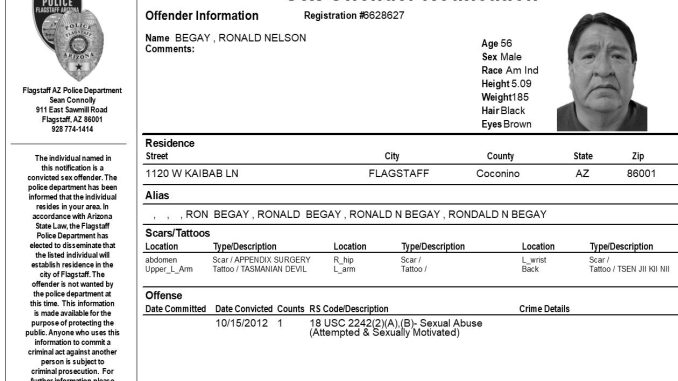 FLAGSTAFF, Az. – The Flagstaff Police Department is requesting your assistance in completing a community notification related to convicted sex offender residing in our community. This notification is being made pursuant to Arizona Revised Statute 13-3825, the Community Notification on Sex Offender Law. The individual listed in the attached electronic flier has been convicted of sex offenses which allow for community notification. They are not wanted by the Flagstaff Police Department at this time.