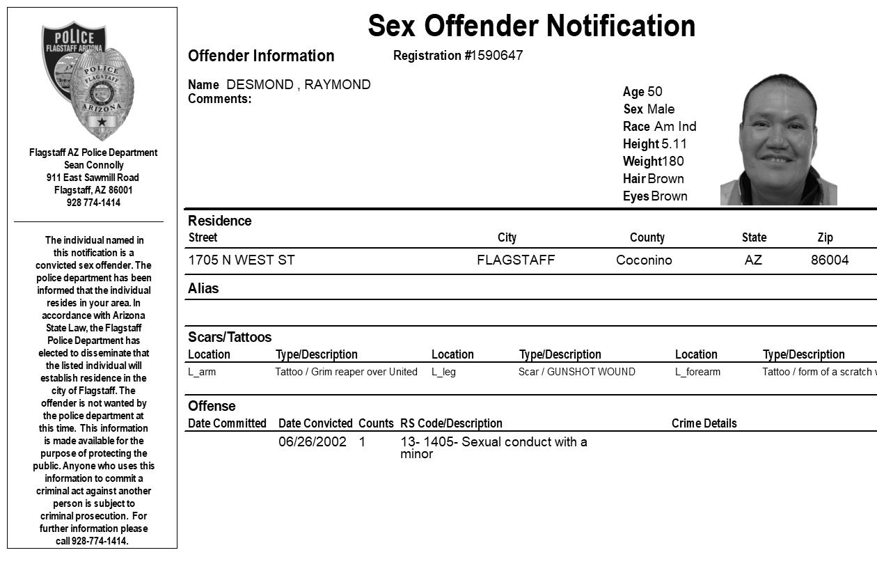 FLAGSTAFF, Az. – The Flagstaff Police Department is requesting your assistance in completing a community notification related to convicted sex offender residing in our community. This notification is being made pursuant to Arizona Revised Statute 13-3825, the Community Notification on Sex Offender Law. The individual listed in the attached electronic flier has been convicted of sex offenses which allow for community notification. They are not wanted by the Flagstaff Police Department at this time.