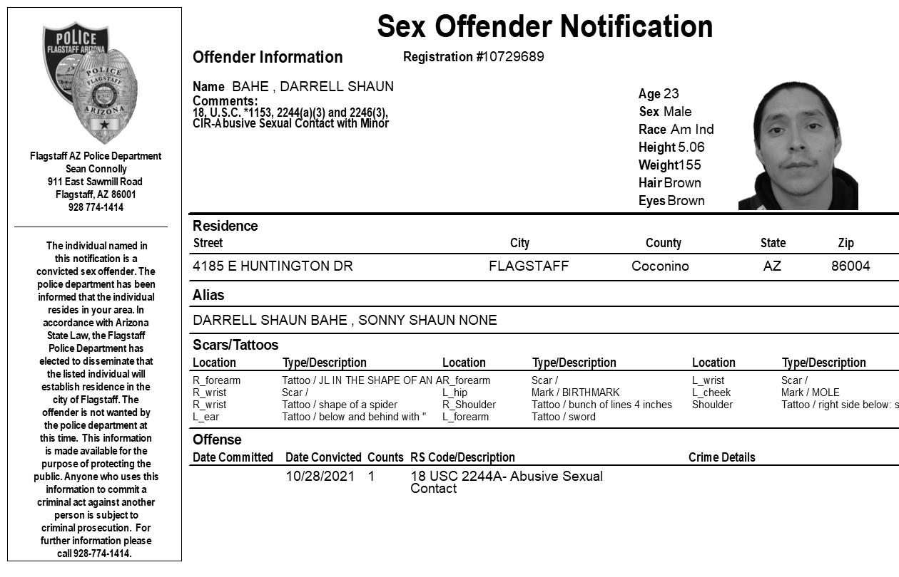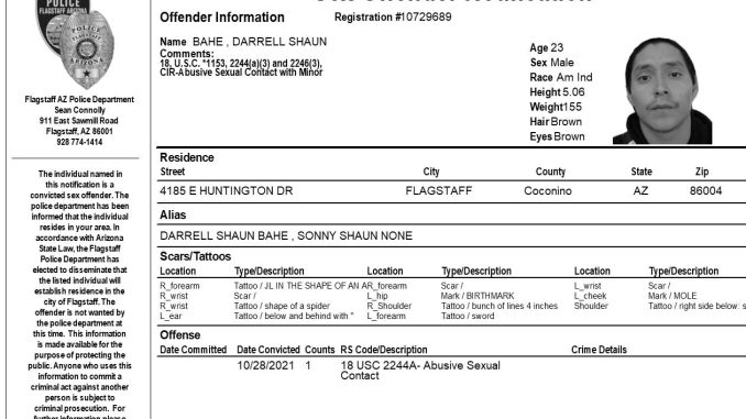 FLAGSTAFF, Az. – The Flagstaff Police Department is requesting your assistance in completing a community notification related to convicted sex offender residing in our community. This notification is being made pursuant to Arizona Revised Statute 13-3825, the Community Notification on Sex Offender Law. The individual listed in the attached electronic flier has been convicted of sex offenses which allow for community notification. They are not wanted by the Flagstaff Police Department at this time.