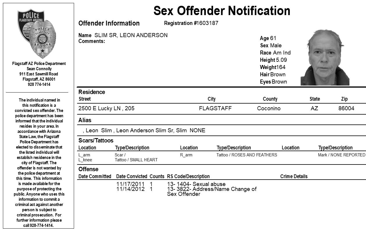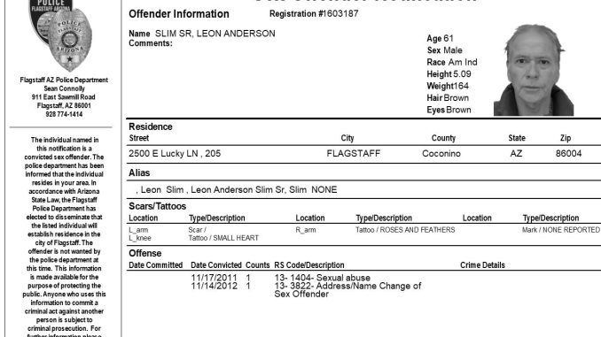 FLAGSTAFF, Az. – The Flagstaff Police Department is requesting your assistance in completing a community notification related to convicted sex offender residing in our community. This notification is being made pursuant to Arizona Revised Statute 13-3825, the Community Notification on Sex Offender Law. The individual listed in the attached electronic flier has been convicted of sex offenses which allow for community notification. They are not wanted by the Flagstaff Police Department at this time.