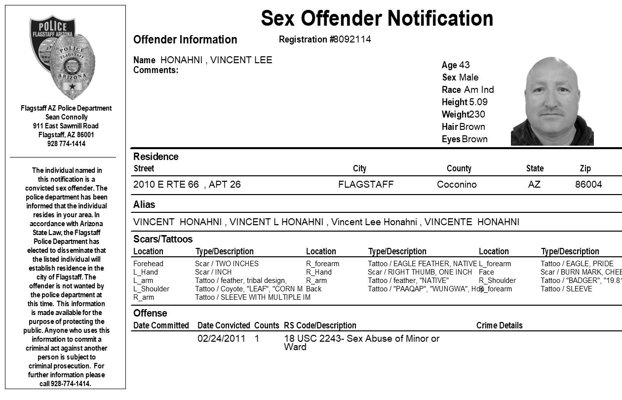 FLAGSTAFF, Az. – The Flagstaff Police Department is requesting your assistance in completing a community notification related to convicted sex offender residing in our community. This notification is being made pursuant to Arizona Revised Statute 13-3825, the Community Notification on Sex Offender Law. The individual listed in the attached electronic flier has been convicted of sex offenses which allow for community notification. They are not wanted by the Flagstaff Police Department at this time.