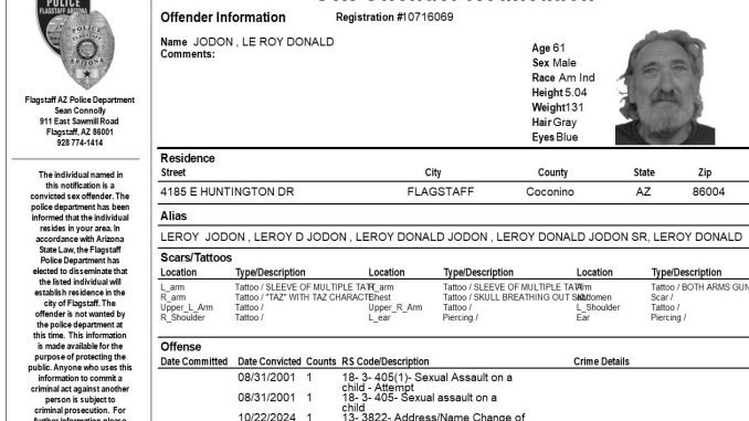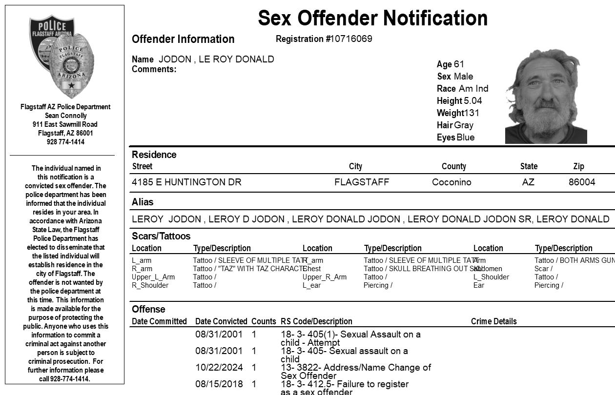 FLAGSTAFF, Az. – The Flagstaff Police Department is requesting your assistance in completing a community notification related to convicted sex offender residing in our community. This notification is being made pursuant to Arizona Revised Statute 13-3825, the Community Notification on Sex Offender Law. The individual listed in the attached electronic flier has been convicted of sex offenses which allow for community notification. They are not wanted by the Flagstaff Police Department at this time.