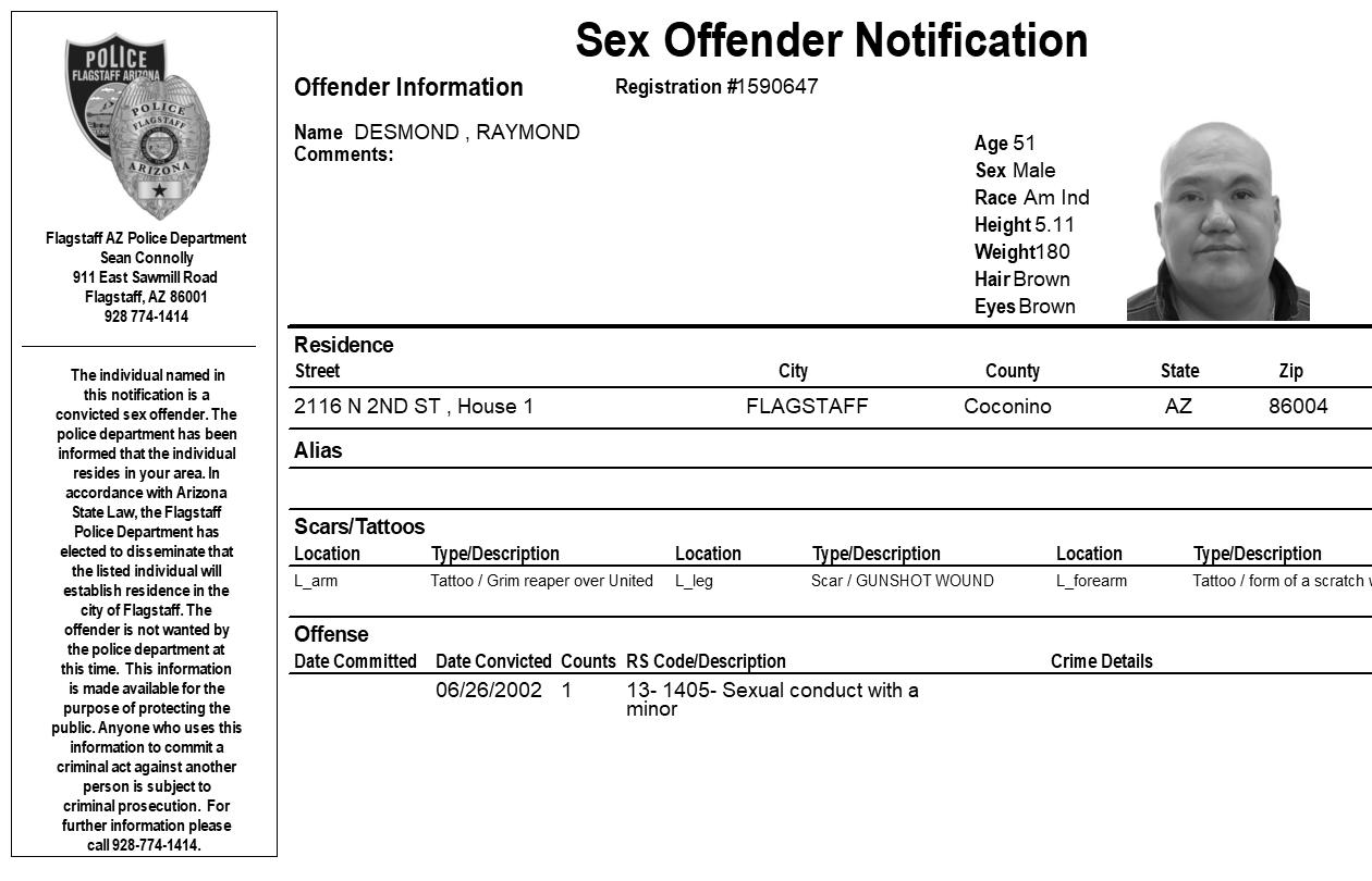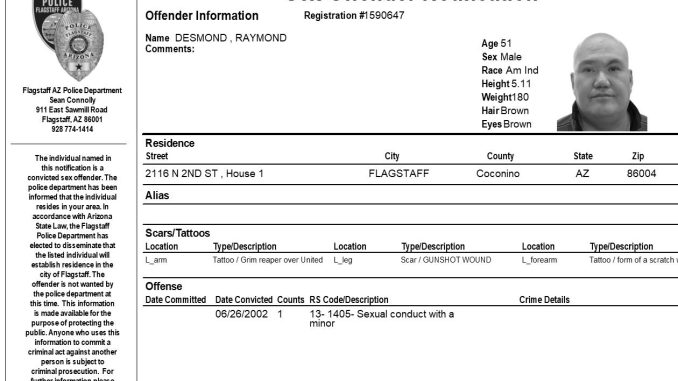 FLAGSTAFF, Az. – The Flagstaff Police Department is requesting your assistance in completing a community notification related to convicted sex offender residing in our community. This notification is being made pursuant to Arizona Revised Statute 13-3825, the Community Notification on Sex Offender Law. The individual listed in the attached electronic flier has been convicted of sex offenses which allow for community notification. They are not wanted by the Flagstaff Police Department at this time.