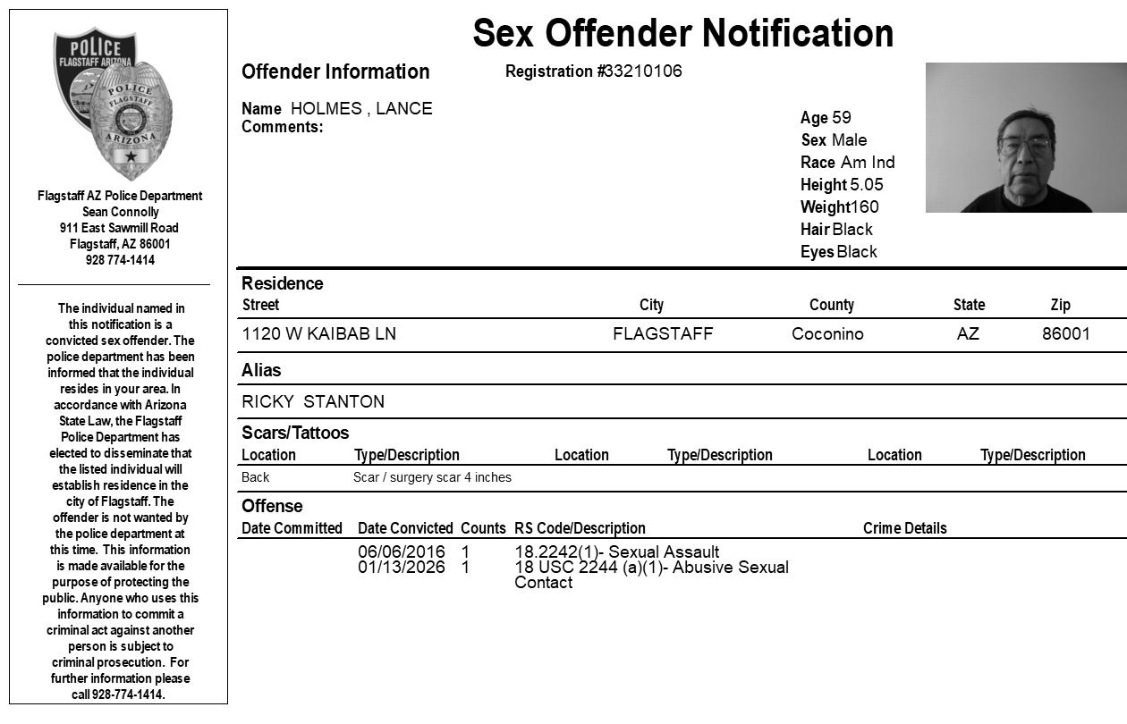 FLAGSTAFF, Az. – The Flagstaff Police Department is requesting your assistance in completing a community notification related to convicted sex offender residing in our community. This notification is being made pursuant to Arizona Revised Statute 13-3825, the Community Notification on Sex Offender Law. The individual listed in the attached electronic flier has been convicted of sex offenses which allow for community notification. They are not wanted by the Flagstaff Police Department at this time.