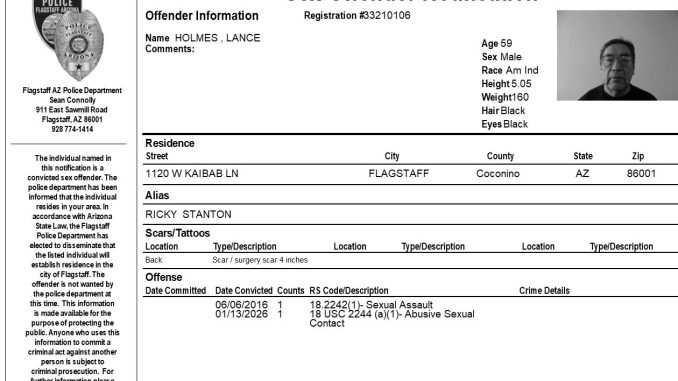 FLAGSTAFF, Az. – The Flagstaff Police Department is requesting your assistance in completing a community notification related to convicted sex offender residing in our community. This notification is being made pursuant to Arizona Revised Statute 13-3825, the Community Notification on Sex Offender Law. The individual listed in the attached electronic flier has been convicted of sex offenses which allow for community notification. They are not wanted by the Flagstaff Police Department at this time.