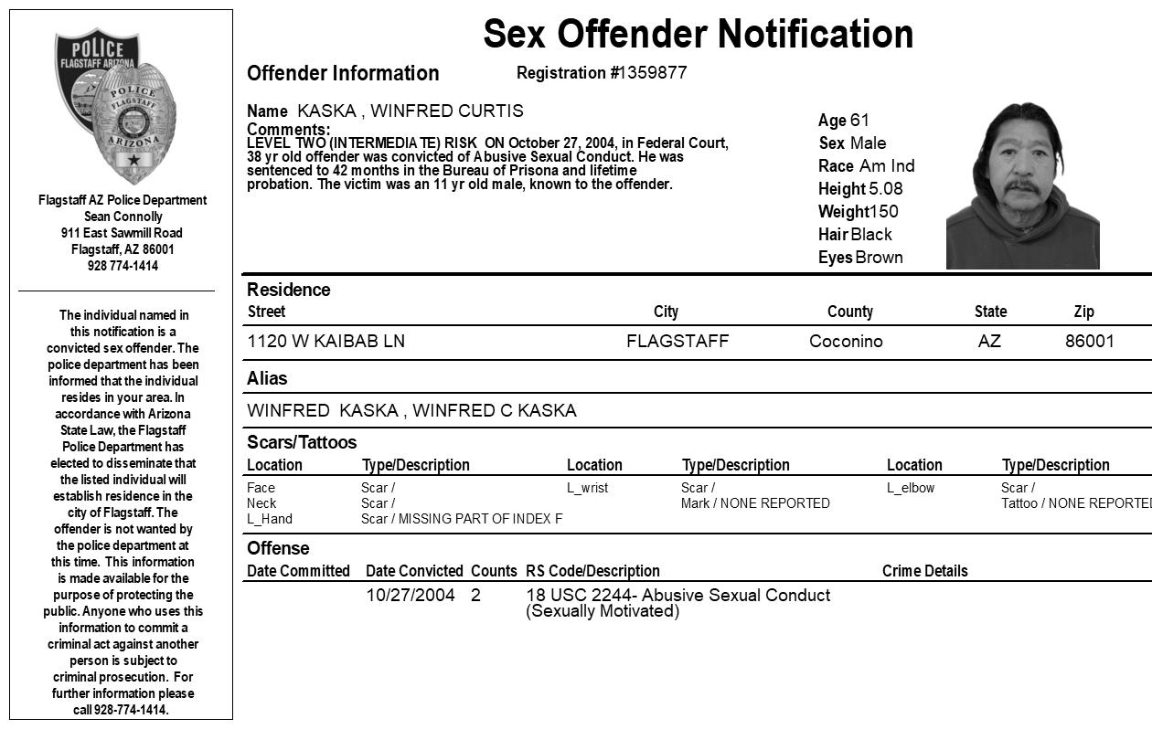 FLAGSTAFF, Az. – The Flagstaff Police Department is requesting your assistance in completing a community notification related to convicted sex offender residing in our community. This notification is being made pursuant to Arizona Revised Statute 13-3825, the Community Notification on Sex Offender Law. The individual listed in the attached electronic flier has been convicted of sex offenses which allow for community notification. They are not wanted by the Flagstaff Police Department at this time.