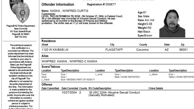 FLAGSTAFF, Az. – The Flagstaff Police Department is requesting your assistance in completing a community notification related to convicted sex offender residing in our community. This notification is being made pursuant to Arizona Revised Statute 13-3825, the Community Notification on Sex Offender Law. The individual listed in the attached electronic flier has been convicted of sex offenses which allow for community notification. They are not wanted by the Flagstaff Police Department at this time.