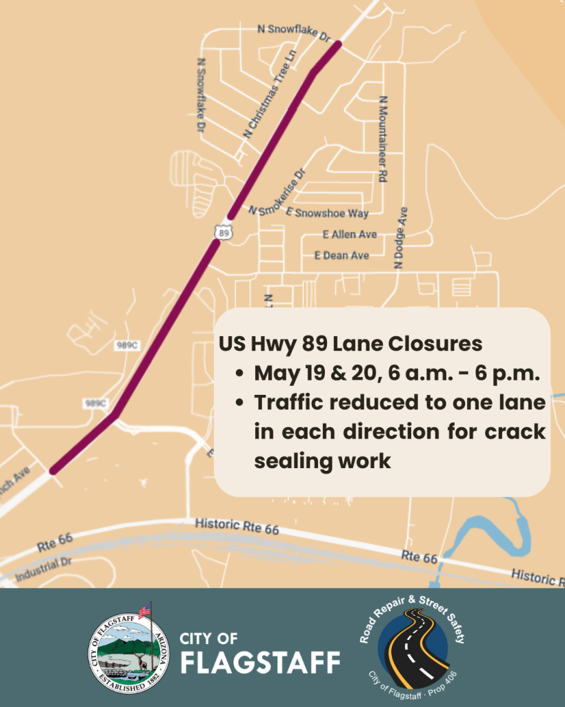 FLAGSTAFF, Ariz – As part of the annual Road Repair and Street Safety Program, lane closures are scheduled on US Highway 89 between N Cummings St and the City limit/ near N Snowflake Dr and E Trails End Dr on May 19 and May 20. Traffic will be reduced to one lane in each direction during the work hours of 6 a.m. to 6 p.m. The lane closures will allow for crack sealing work to be performed on the roadway. Work under the Road Repair and Street Safety Program is also ongoing in other areas of the City and projects are currently underway in the Crestview and Presidio neighborhoods, as well as along County Club Dr and Huntington Dr. The City and its contractor are taking all possible measures to minimize the impact of this work on local residents and businesses. Thank you for your patience as we work to improve the City’s roadways for all users. The annual Road Repair and Street Safety program is funded by Flagstaff voters’ 2014 approval of Proposition 406, a $100 million, 20-year dedicated sales tax for road repair and street safety projects. For more information, including project updates, visit flagstaff.az.gov/roadrepair.