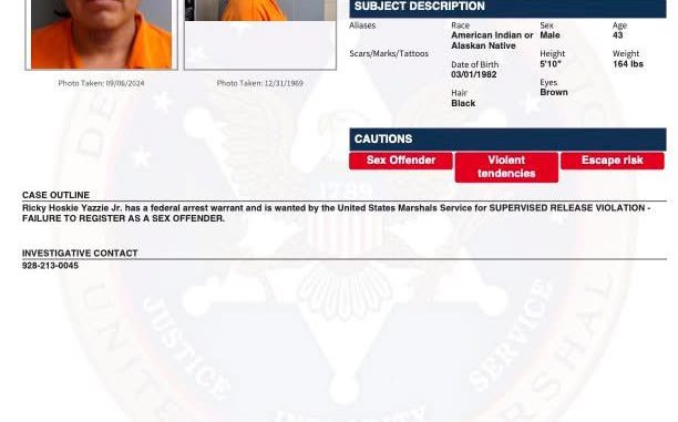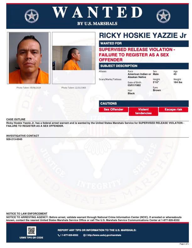 WANTED BY US MARSHALS: Ricky Hoskie Yazzi Jr June 3, 2025 SPONSORED FREE POST The U.S. Marshals Service needs the community’s assistance in finding the following individual: Ricky Hoskie Yazzie Jr. Report any tips or information to the U.S. Marshals at 1-877-926-8332 or at http://www.usdoj.gov/marshals
